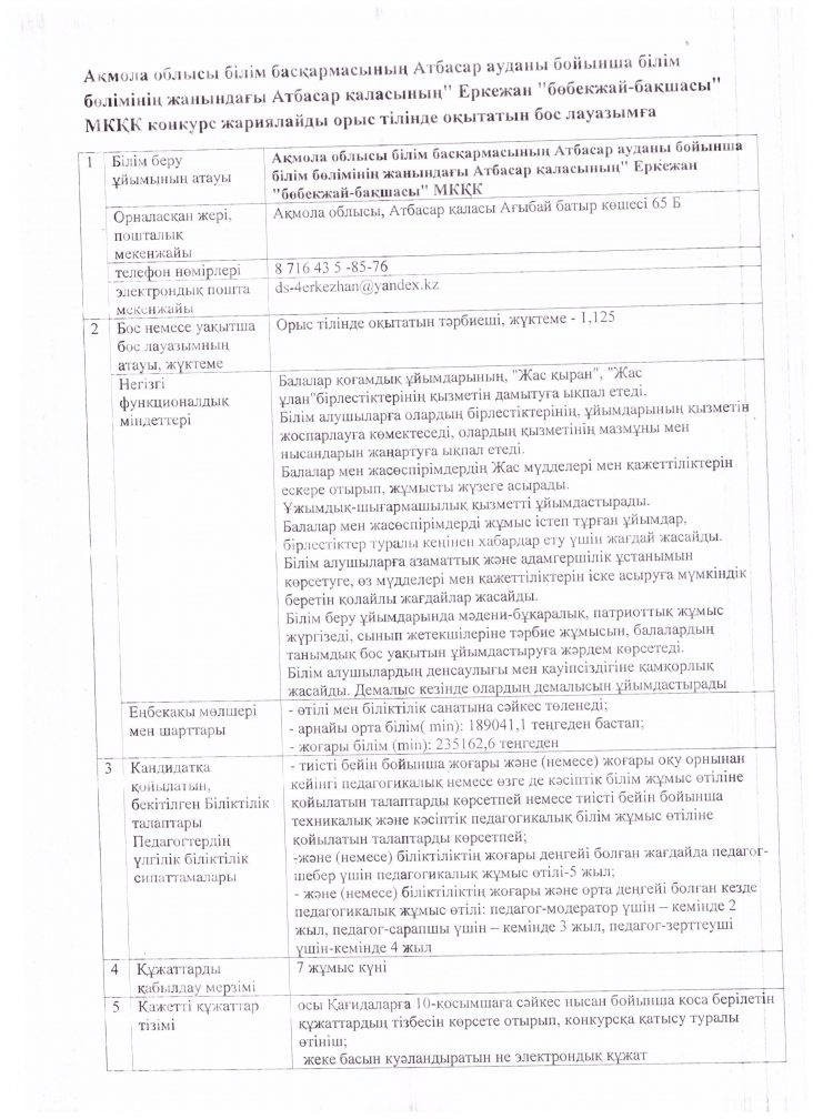 Государственное коммунальное казенное предприятие «Ясли – сад «Еркежан» города Атбасар при отделе образования по Атбасарскому району управления образования Акмолинской области»