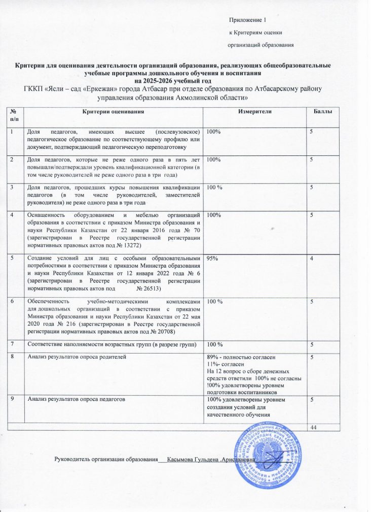 2025–2026 оқу жылына мектепке дейінгі оқыту мен тәрбиелеудің жалпы білім беретін оқу бағдарламаларын іске асыратын білім беру ұйымдарының қызметін бағалау критерийлері