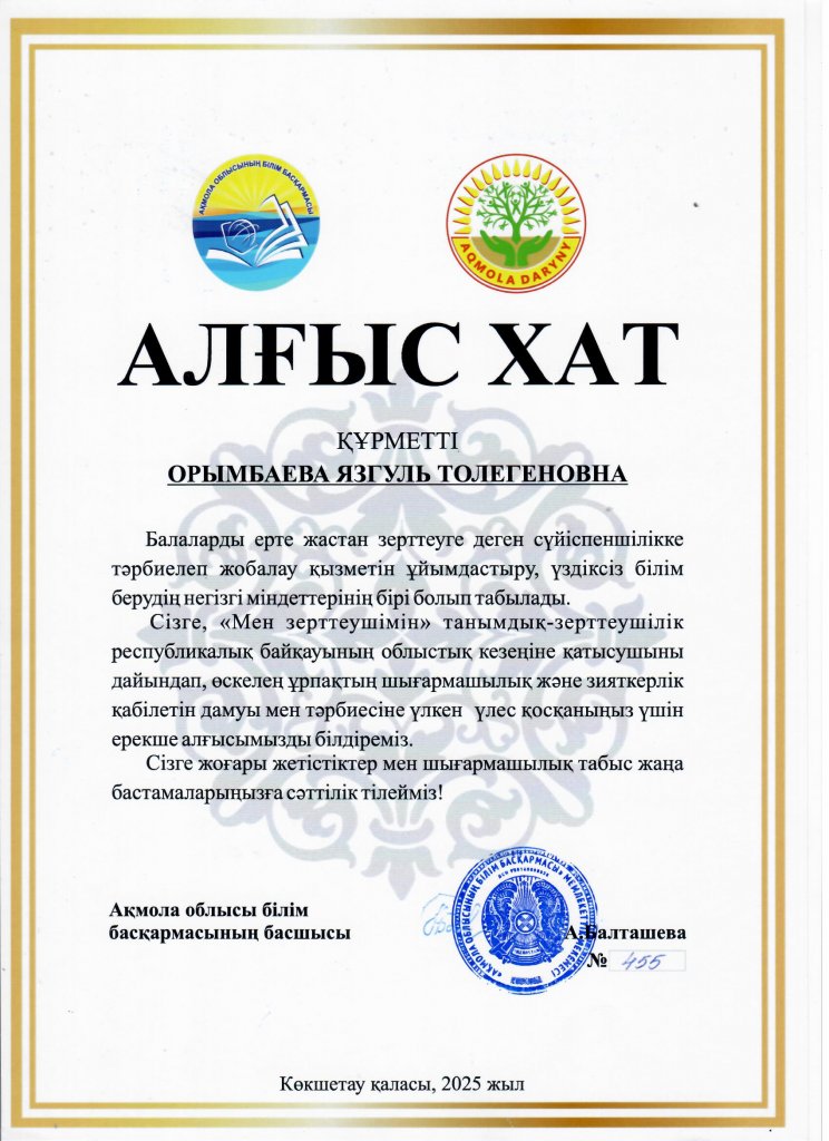«Мен зерттеушімін» танымдық – зерттеушілік республикалық байқауының облыстық кезеңінде І орынға ие болғаны үшін Атбасар ауданы «Еркежан» бөбекжай-бақшасының тәрбиешісі Орымбаева Язгуль Толегеновна және тәрбиеленушілері Темиргалиев Куаныш, Серикжанқызы Айлин, Қайдар Шамиль, Мадешева Айсулу марапатталады