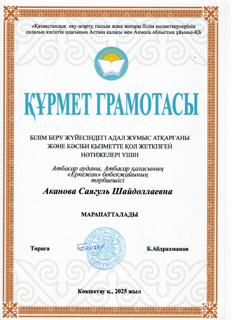 Ұстаздар күні қарсаңында Атбасар ауданының шығармашылықпен жұмыс істейтін педагогтері №1 жалпы білім беретін мектепте бас қосты.Осы мерекелік күні «Еркежан» бөбекжайының тәрбиешісі Ақанова Саягуль Шайдоллаевна жоғары кәсібилігі, өз ісіне адалдығы мен балаға деген сүйіспеншілігі үшін құрмет грамотасымен марапатталды.