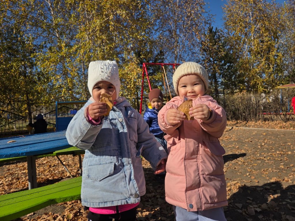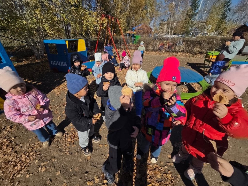 Ересек «Балапан» тобының балалары күзгі жапырақтардың түрлерін, түстерін және пішіндерін бақылап, күз мезгіліндегі табиғаттағы өзгерістер туралы әңгімелесті. Түрлі- түсті жапырақтар мен әдемі жапсыру жұмыстарын жасап, өз шығармашылықтарын көрсетті.