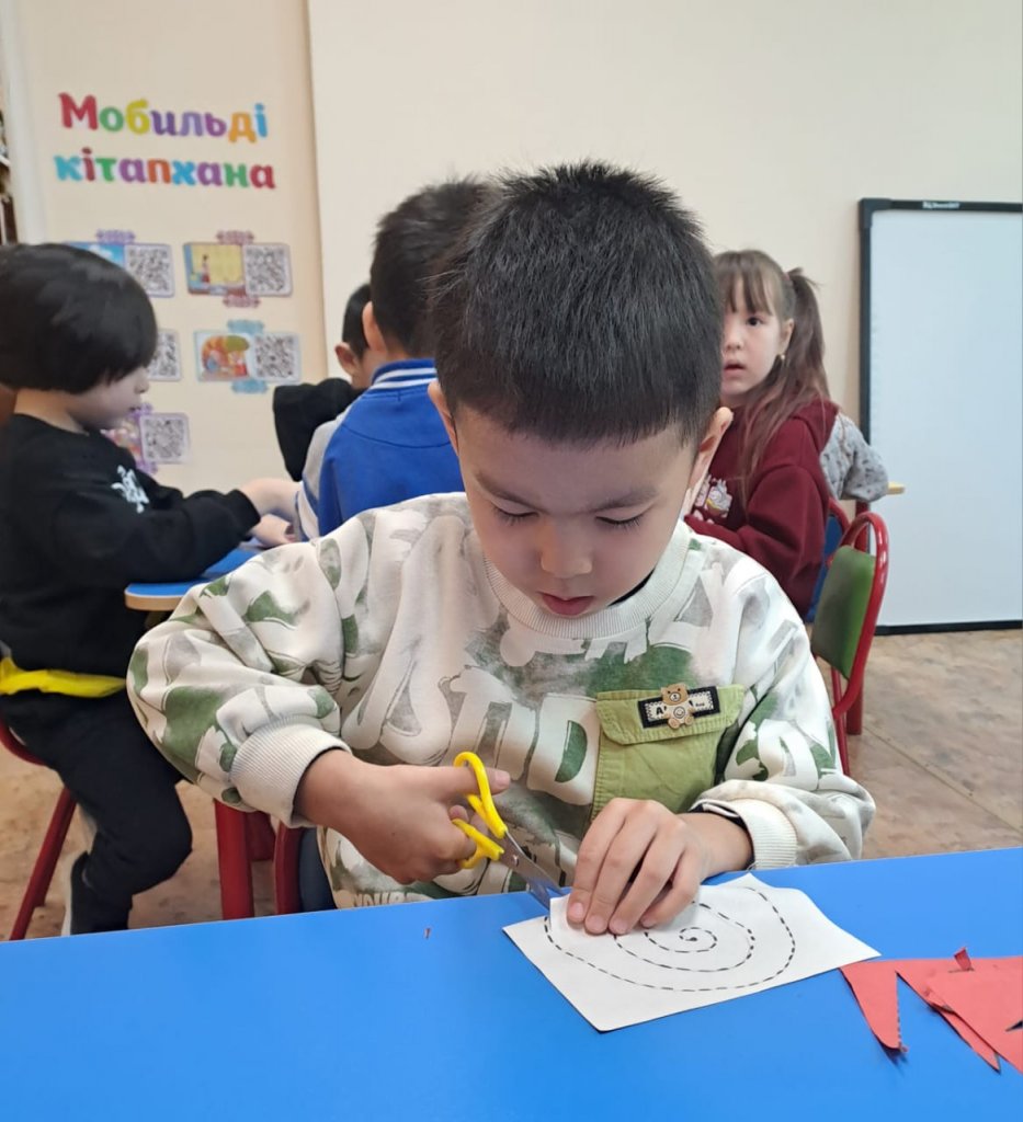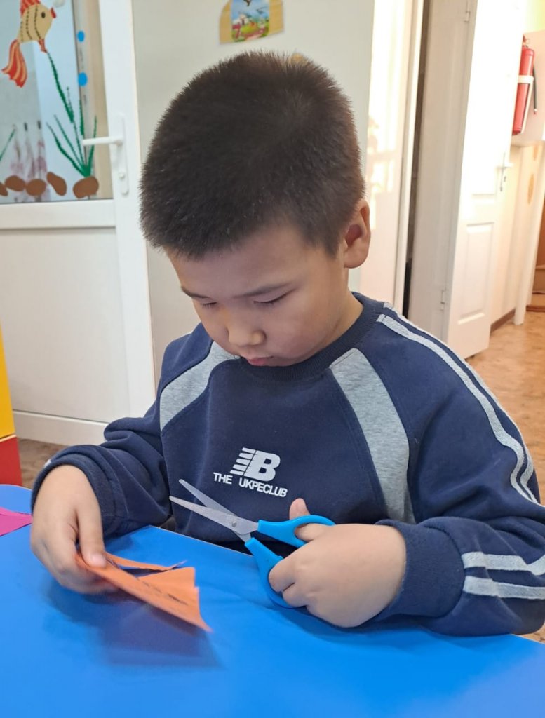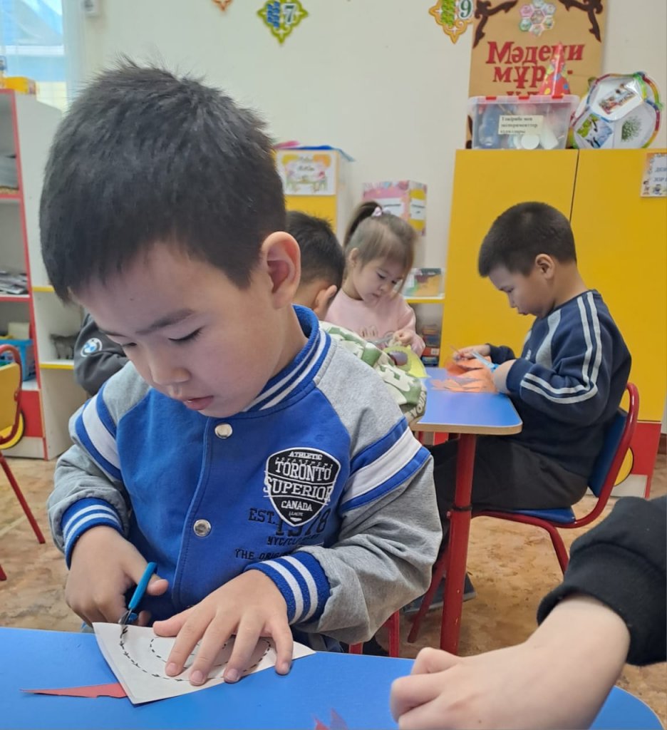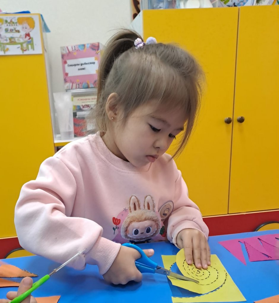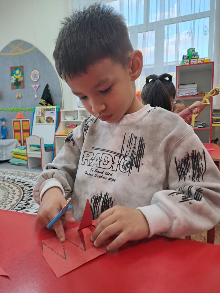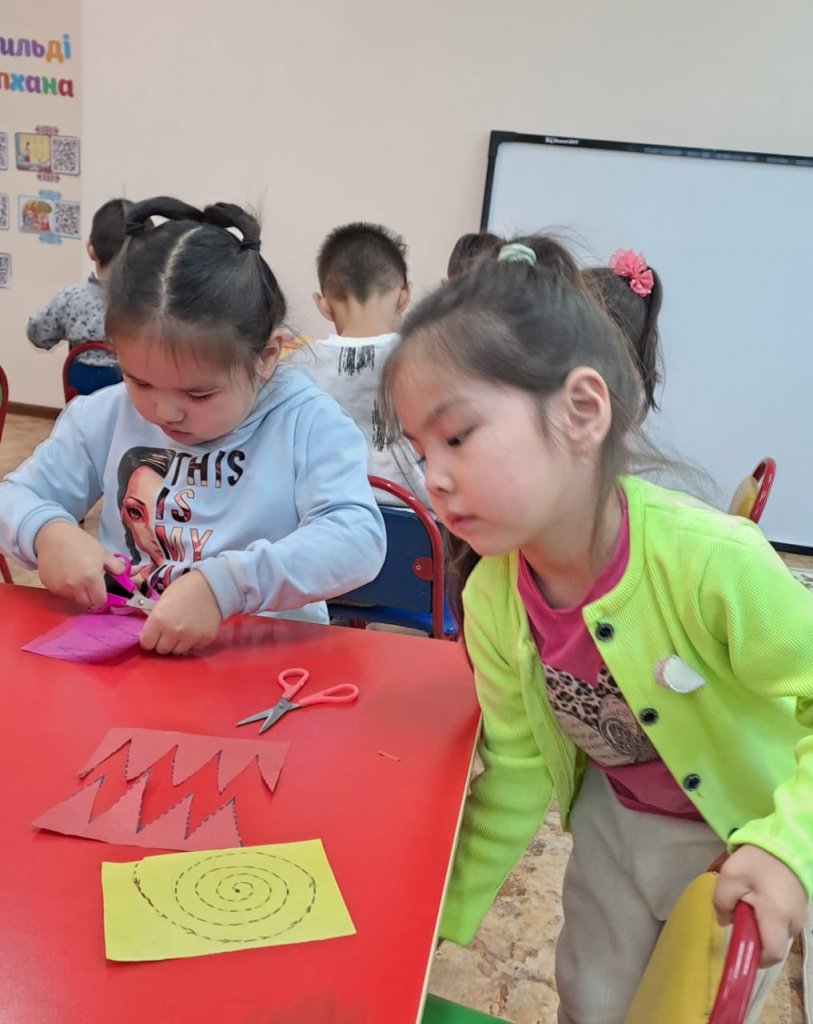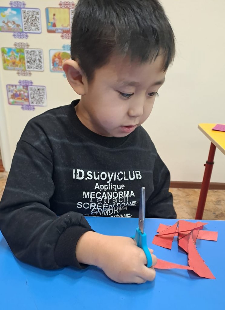 «Арай» тобында қиып-кесу арқылы ұсақ моториканы дамытуға арналған ҰӘ өтті. Қайшымен жұмыс жасау қол бұлшықеттерін нығайтып, жазуға қолды дайындайды, шыдамдылық пен дербестікті қалыптастырады. Жаттығу карточкалары әртүрлі қиындық деңгейінде болды. Мұндай шығармашылық сабақтар баланың үйлесімді дамуына, өзіне деген сенімділіктің артуына және жетістікке жетуден туатын қуаныш сезіміне ықпал етеді.