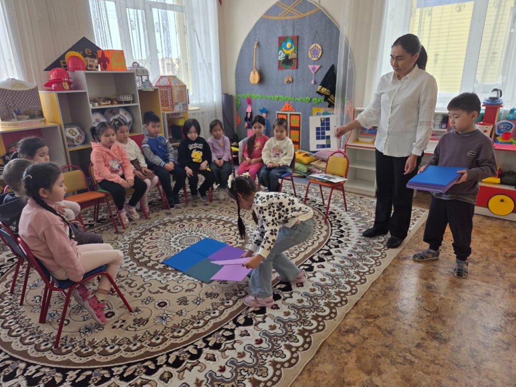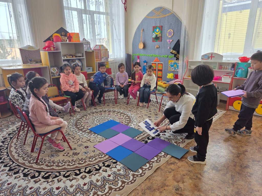 Мақсаты:Балалардың танымдық, қимыл-қозғалыс және қарым-қатынас дағдыларын еден үстінде белсенді ойын арқылы дамыту. Қимыл-қозғалыс үйлесімділігін, ептілігін және кеңістікте бағдарлануын жетілдіру. Логикалық ойлауды қалыптастыру.