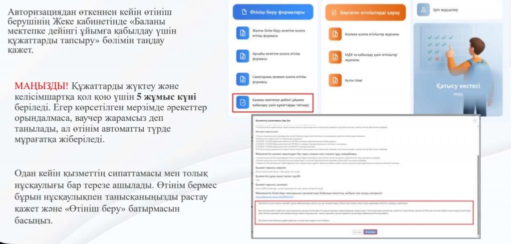 «Баланы мектепке дейінгі ұйымға қабылдау үшін қужаттарды тапсыру» қызметіне өтінім беру бойынша нұсқаулық»