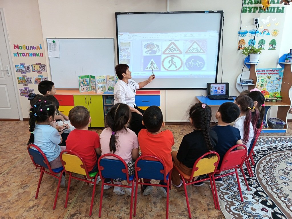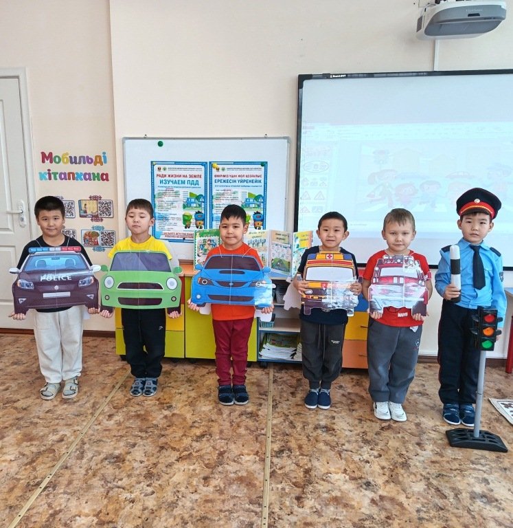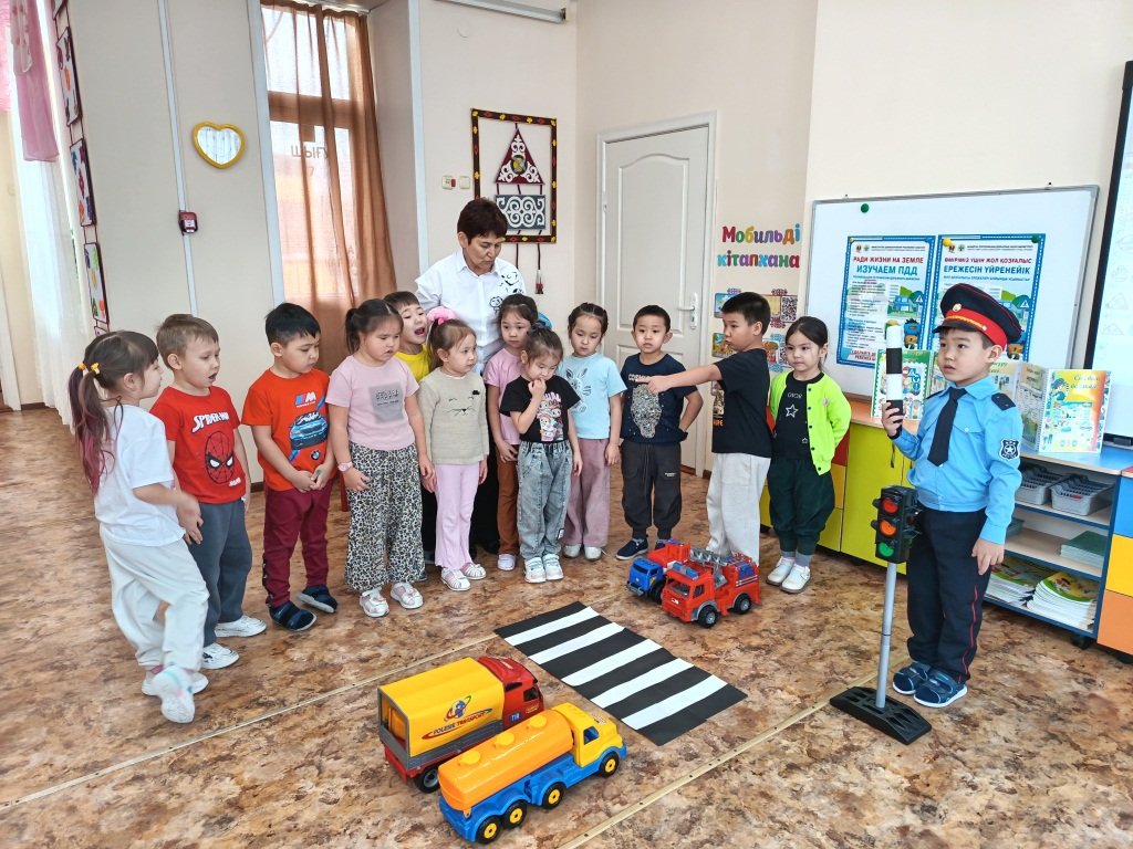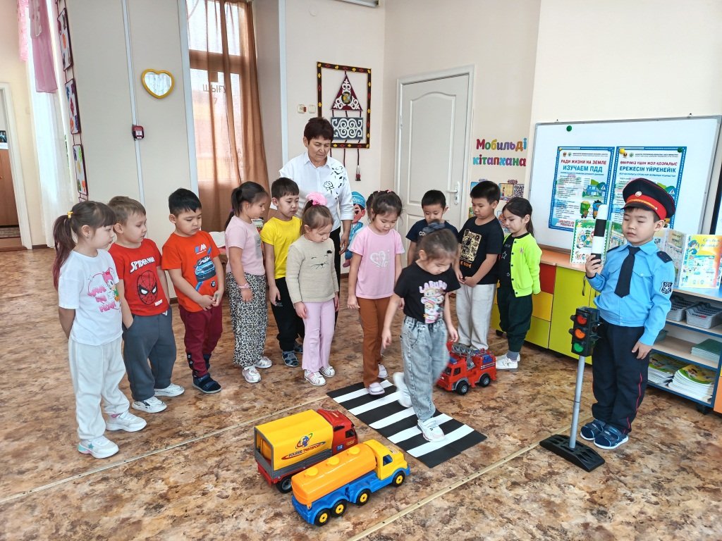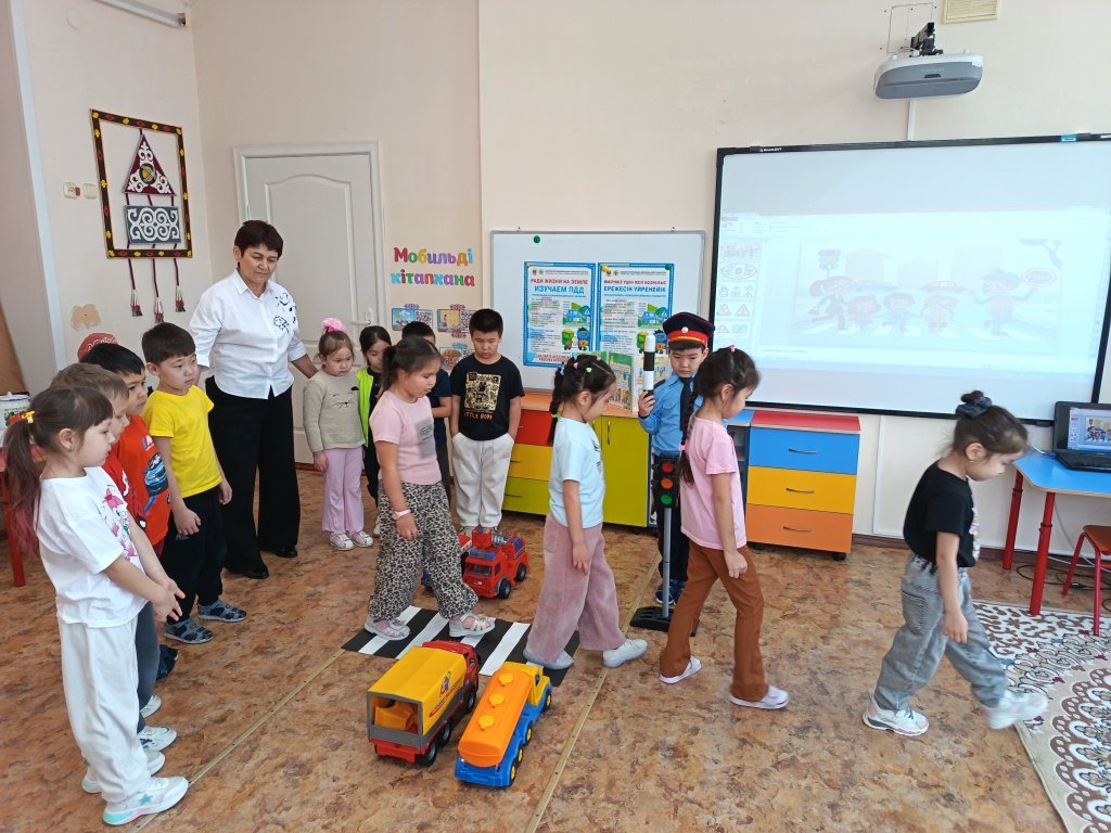 Балалар ойын түрінде жолды қауіпсіз кесіп өту ережелерін үйреніп, маңызды көліктердің атын есте сақтап, жол белгілері не үшін қажет екені жайында білді. Жүргізілген жұмыс нәтижесінде балалар жолда жүру ережелері туралы білім алды.